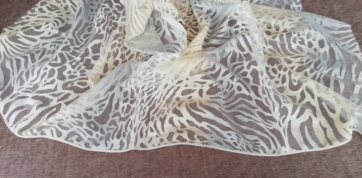 tenda a metro con altezza 3 mt, finituara sotto con piombino, tessuto in organza leggera e trasparente, con lavorazioni sfumate tra il beige oro e grigio.